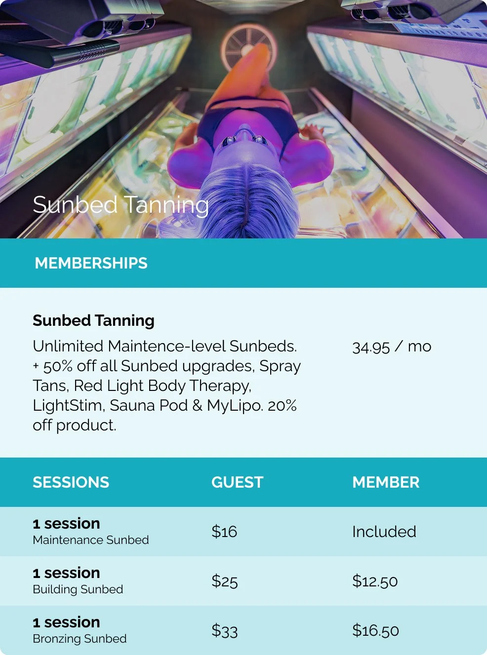 Explore our flexible pricing for tanning and light therapy services. Discover the perfect balance of quality and value as you embark on a journey to achieve a radiant glow and rejuvenating wellness.